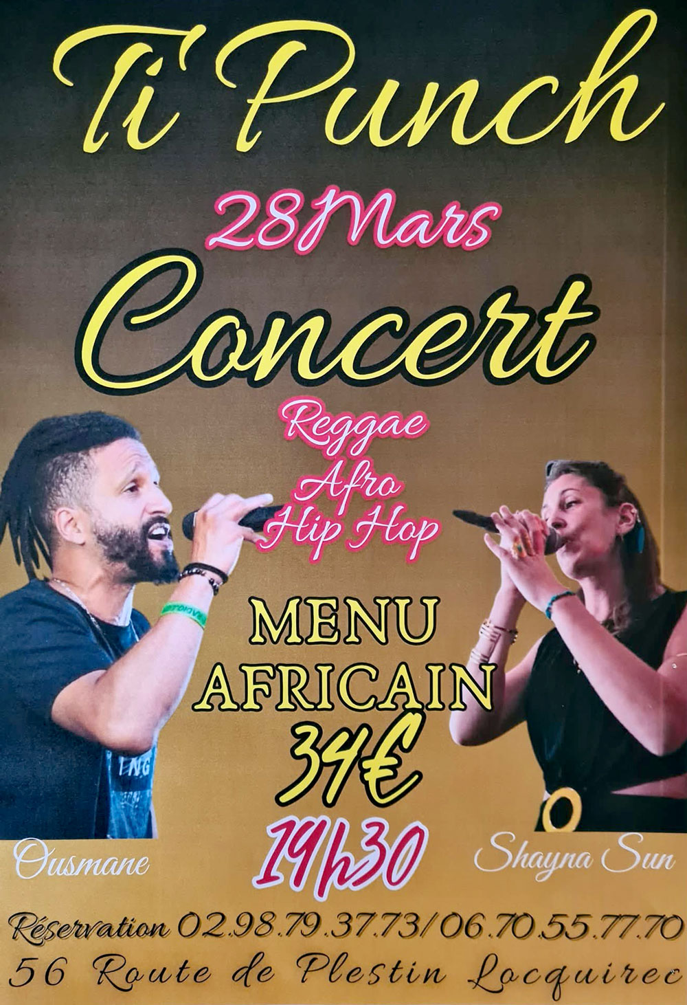 Soirée Dîner Africain et Concert au Ti Punch, animée par Ousmane et Shayna Sun, qui vous ambianceront avec leurs musiques et chants Reggae, Afro et Hip Hop.
