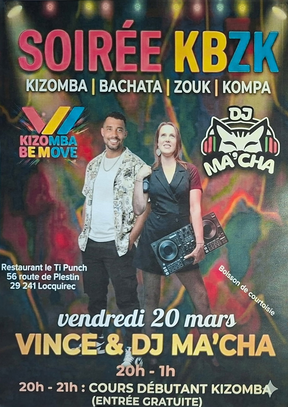 Rendez-vous au Ti Punch pour une soirée dansante KBZK (Kizomba, Bachata, Zouk, Kompa) animée par Vince et DJ MA'CHA. Cours débutants Kizomba de 20h à 21h (entrée gratuite).